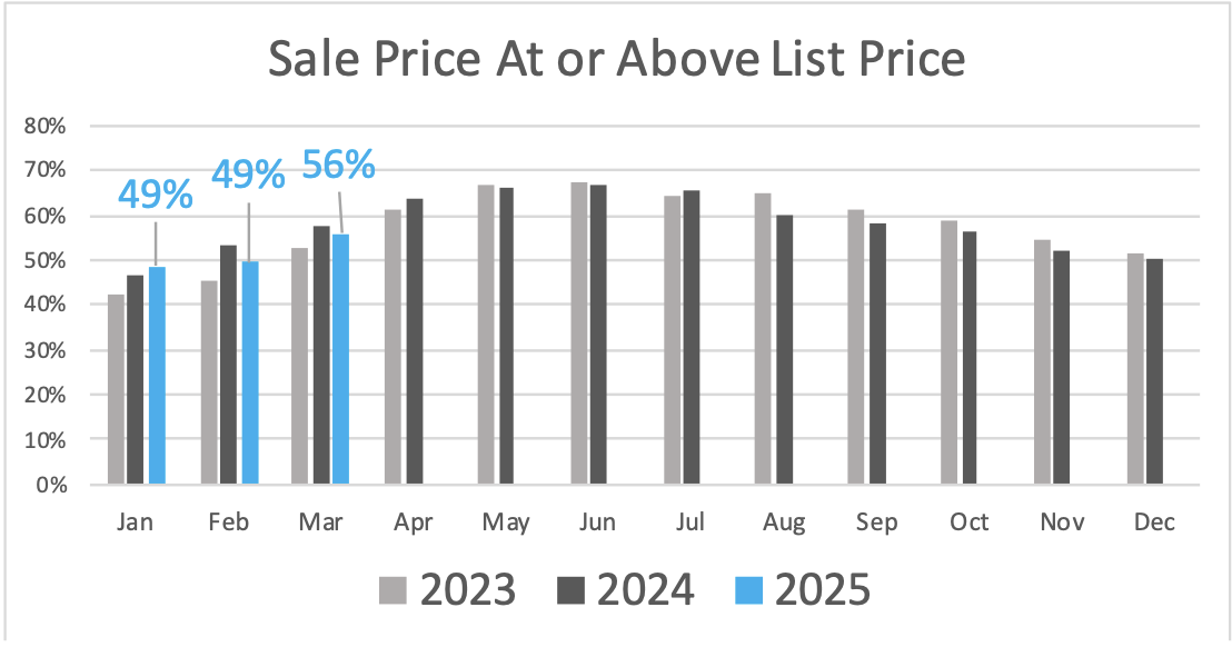 Pricing, however, tells a more optimistic story. The average sale price rose 5% year-over-year, underscoring the strength of buyer competition in key price ranges and neighborhoods. Sellers of well-prepared homes are continuing to see favorable results: 56% of March sales closed at or above the asking price, with multiple offers still a frequent occurrence. That share is expected to climb into the spring and summer months.