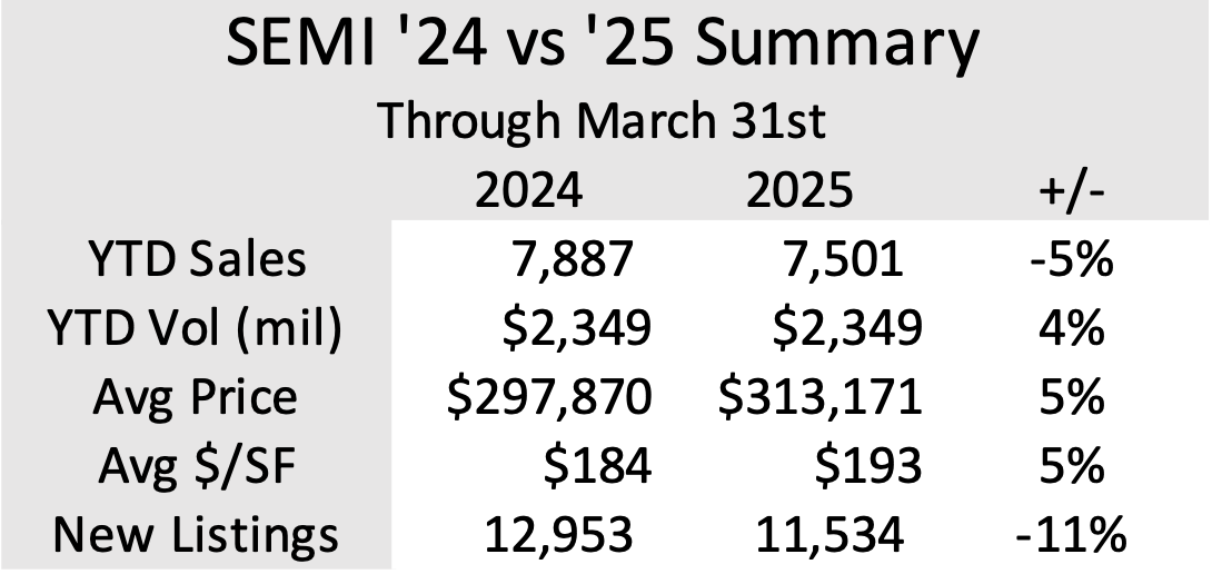 Year-over-year, closed sales dipped 5% in the first quarter, driven in part by a limited supply of desirable homes. New listings fell 11% compared to the same period last year, tightening inventory at a time when demand remains steady. While total inventory is up 11% from a year ago—and 8% compared to 2023—much of that increase stems from lingering carryover from late last year. Homes that are move-in ready remain in short supply