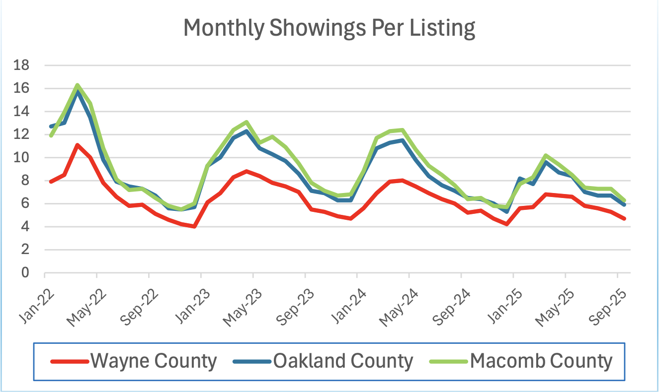 Showings, which are an early signal of buyer demand, have kept pace with prior years overall. But with more listings on the market, the number of showings per listing has gradually slipped to around 6 showings per month in Oakland and Macomb and 4 in Wayne County.